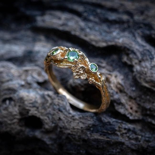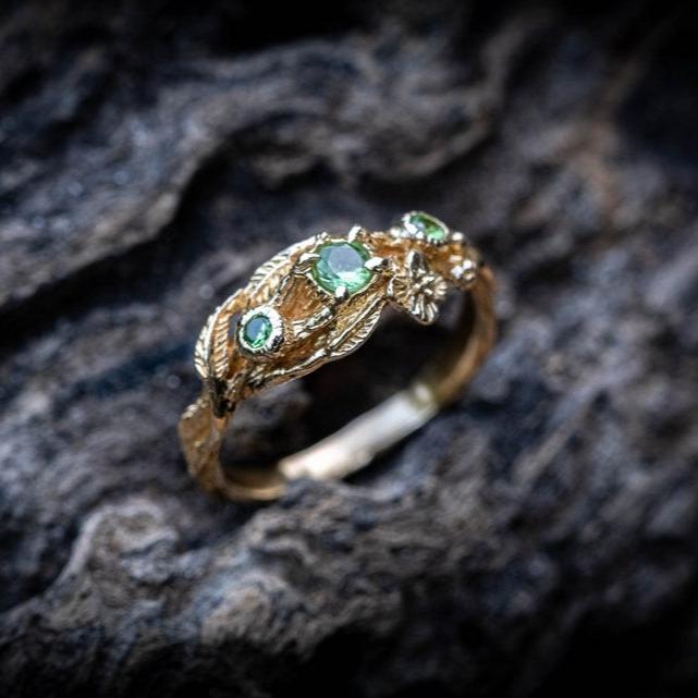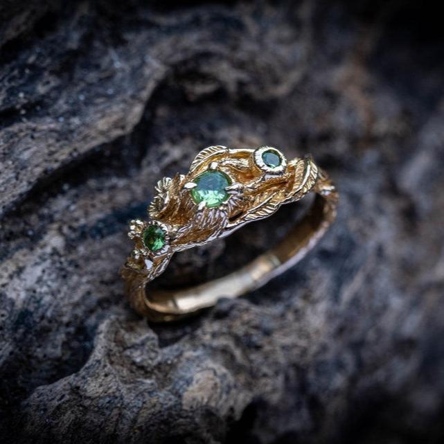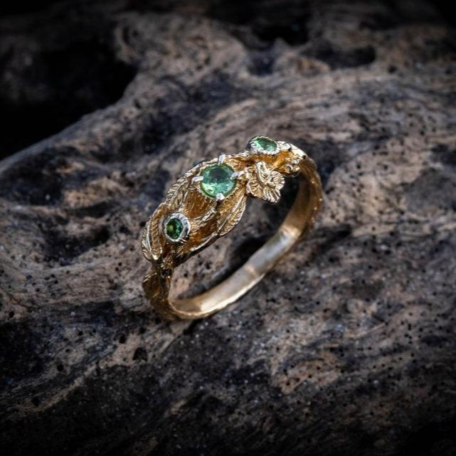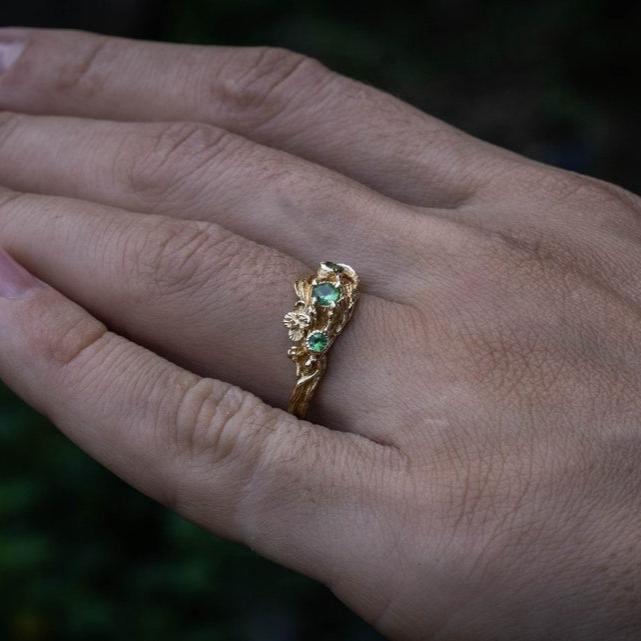Découvrez la beauté envoûtante des bagues en or 14 carats pour femmes , un chef-d'œuvre de Trillobeat. Cette bague inspirée de la nature, « Ria », présente des pierres précieuses naturelles serties sur une branche d'arbre avec des feuilles et des fleurs, symbolisant l'énergie féminine de la nature et le pouvoir du mystère.