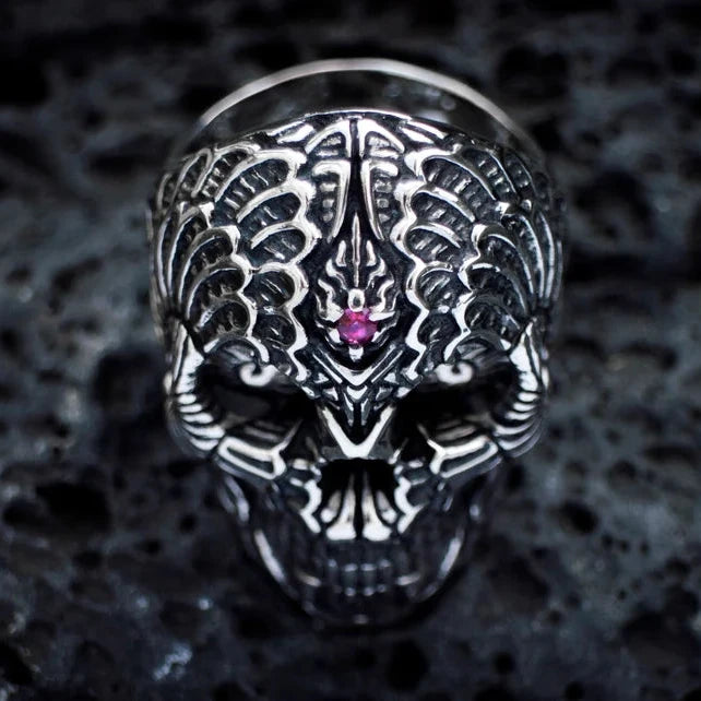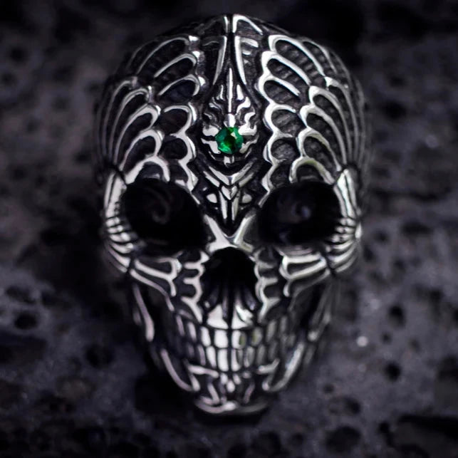 La bague est ornée d'une pierre précieuse de 3 mm sertie sur le front du crâne, avec des options telles que la tsavorite, le diamant noir, le saphir ou le rubis, vous offrant la possibilité de personnaliser cette pièce pour refléter votre style personnel et votre connexion spirituelle. Les détails complexes du crâne, combinés aux matériaux luxueux, font de cette bague une pièce remarquable qui attire l'attention.