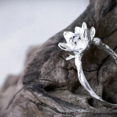 Adoptez la croissance spirituelle et la pureté avec la bague en argent en forme de fleur de lotus de Trillobeat. Cette bague fabriquée à la main présente un superbe motif de fleur de lotus , symbolisant l'illumination, la renaissance et la beauté divine . Fabriquée en argent sterling brillant , cette bague offre un mélange de symbolisme significatif et d'élégance intemporelle.