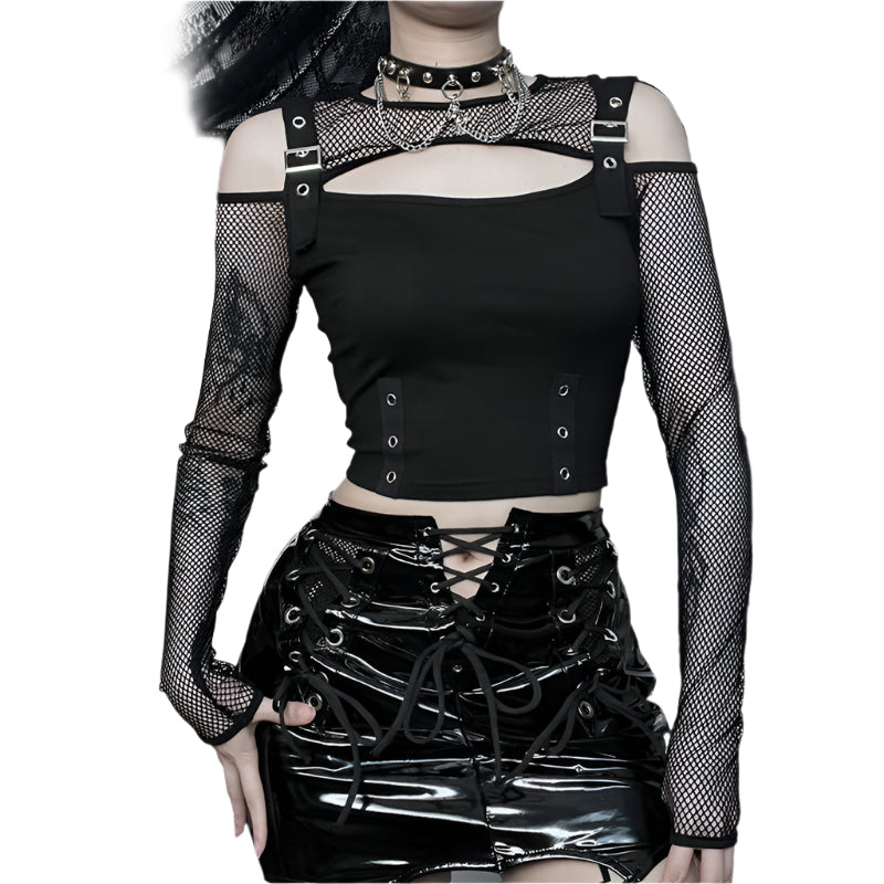 Libérez votre côté audacieux avec notre haut noir en résille . Ce haut mélange parfaitement la mode gothique avec le streetwear contemporain, vous donnant un look audacieux et unique. Le design creux en résille et le motif patchwork ajoutent un élément frappant, ce qui en fait un choix idéal pour celles qui aiment se démarquer. 🖤🔥