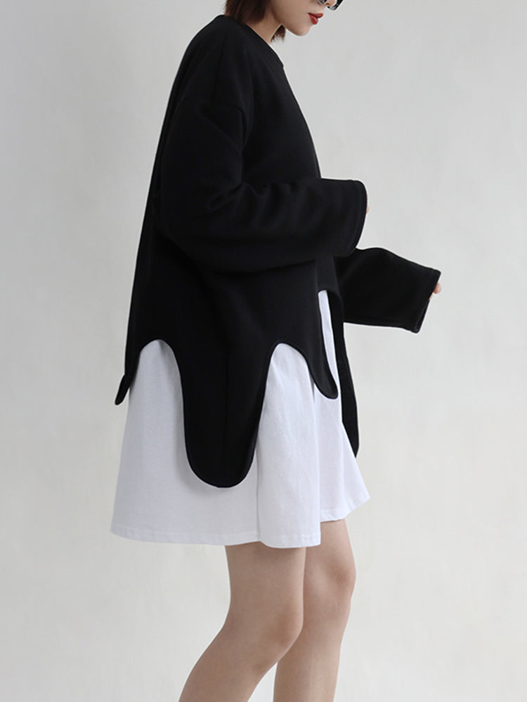 Featuring a classic crew neckline and relaxed longline silhouette, this piece drapes naturally for a flattering, modern shape. The distinctive wave-cut hem design adds movement and personality, transforming a simple sweatshirt into a statement essential.