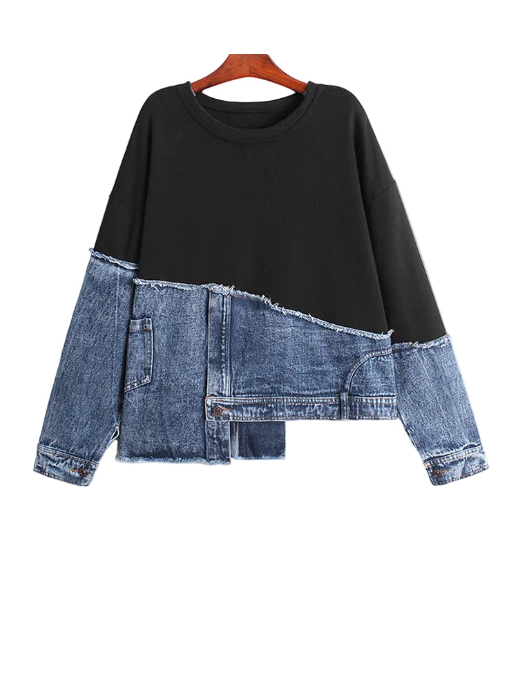 Available in versatile black and grey color options, it pairs seamlessly with high-waisted trousers, cargos, or skirts. Combining structured denim panels with a soft sweatshirt base, it delivers all-day comfort with standout edge.
