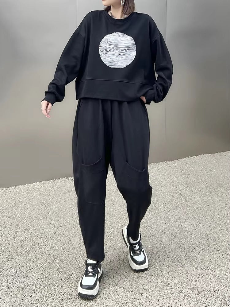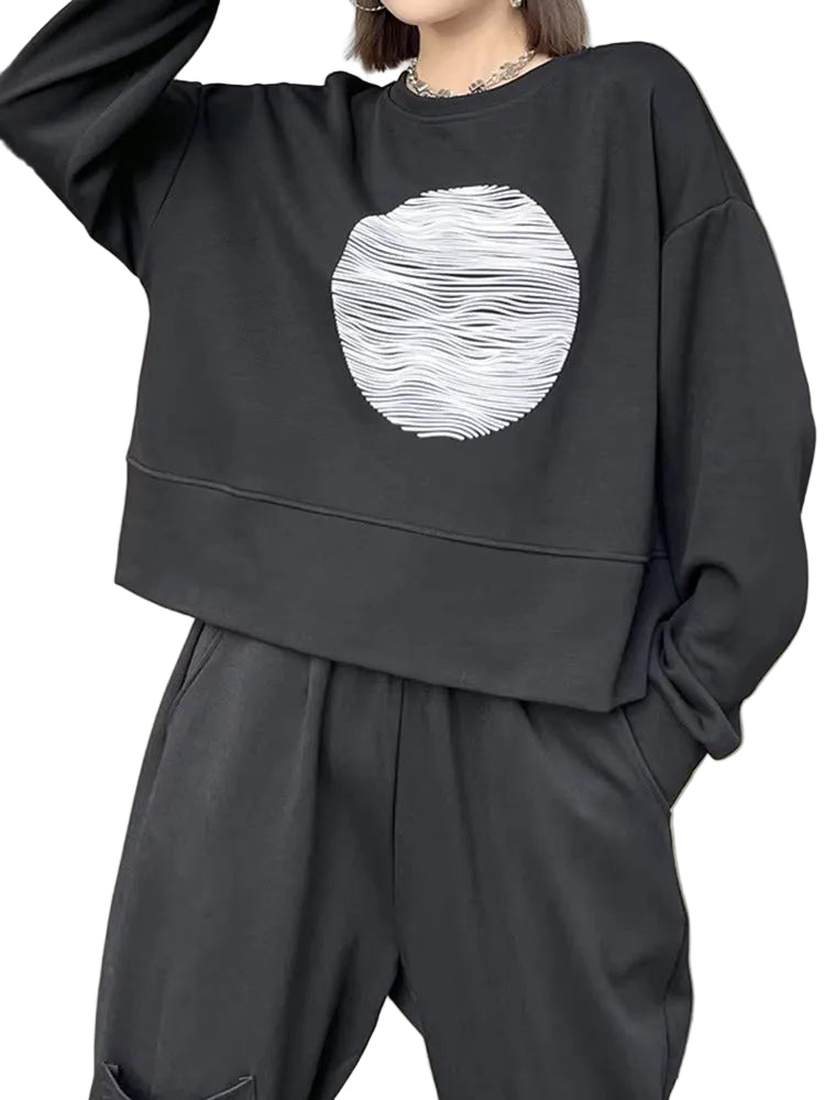 Make a confident statement with the Womens Graphic Sweatshirts, where modern minimalism meets bold visual identity. The sleek deep black base is elevated by a striking abstract white circular graphic that instantly draws the eye.