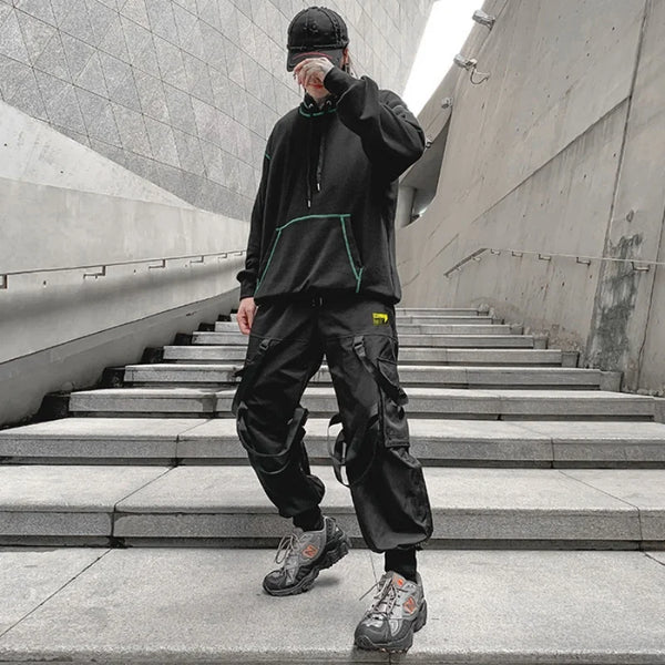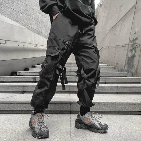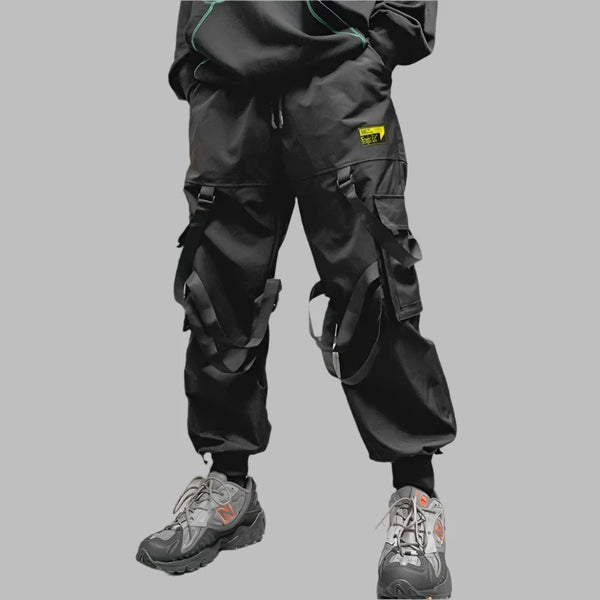 Pantalon noir patchwork à banderoles – Cyber Techwear Ignorer et passer au contenu